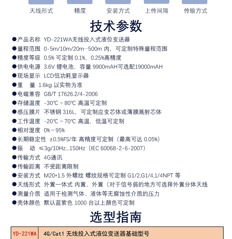 YD-221WA無線投入式液位變送器,量程范圍 0-5m/10m/20m…500m 內,可定制特殊量程范圍精度等級 0.5% 可定制 0.1%,0.25%高精度